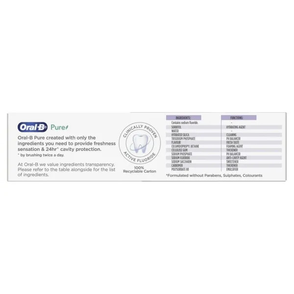 • Oral-B Pure created with only the ingredients you need to provide freshness sensation & 24hr^ cavity protection.