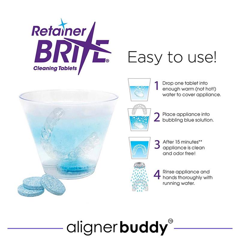Retainer Brite Cleaning Tablets Specially-Formulated to Help Keep Removable Dental Appliances Sparkling Clean Kills 99% of Common Odour-Causing Bacteria, Helps Remove Plaque & Tartar Cleans & Brightens Removable Dental Appliances Certified Kosher. **DO NOT allow dental appliances to soak for more than 15 minutes. Remove promptly and rinse thoroughly with water.
